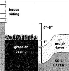 5. Spread the mulch evenly and smooth it out. Aim for a depth of 3″. Keep the top of the mulch 1″ below the edge of the walkway or grass and 4″-6″ below the siding of your house. Don’t bury trunks or stems of plants; create mulch mounds, or bury the tree trunk of your trees. A depth of 3″-4″ is ideal for mulch to effectively hold moisture, prevent weeds, add organic matter to the soil, and improve the appearance of your property.”
